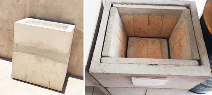 Medidas de profundidade de 58cm por 66/76/ e 88cm, o braseiro é revestido conforme seu projeto. Revestimento interno com tijolo refratário.